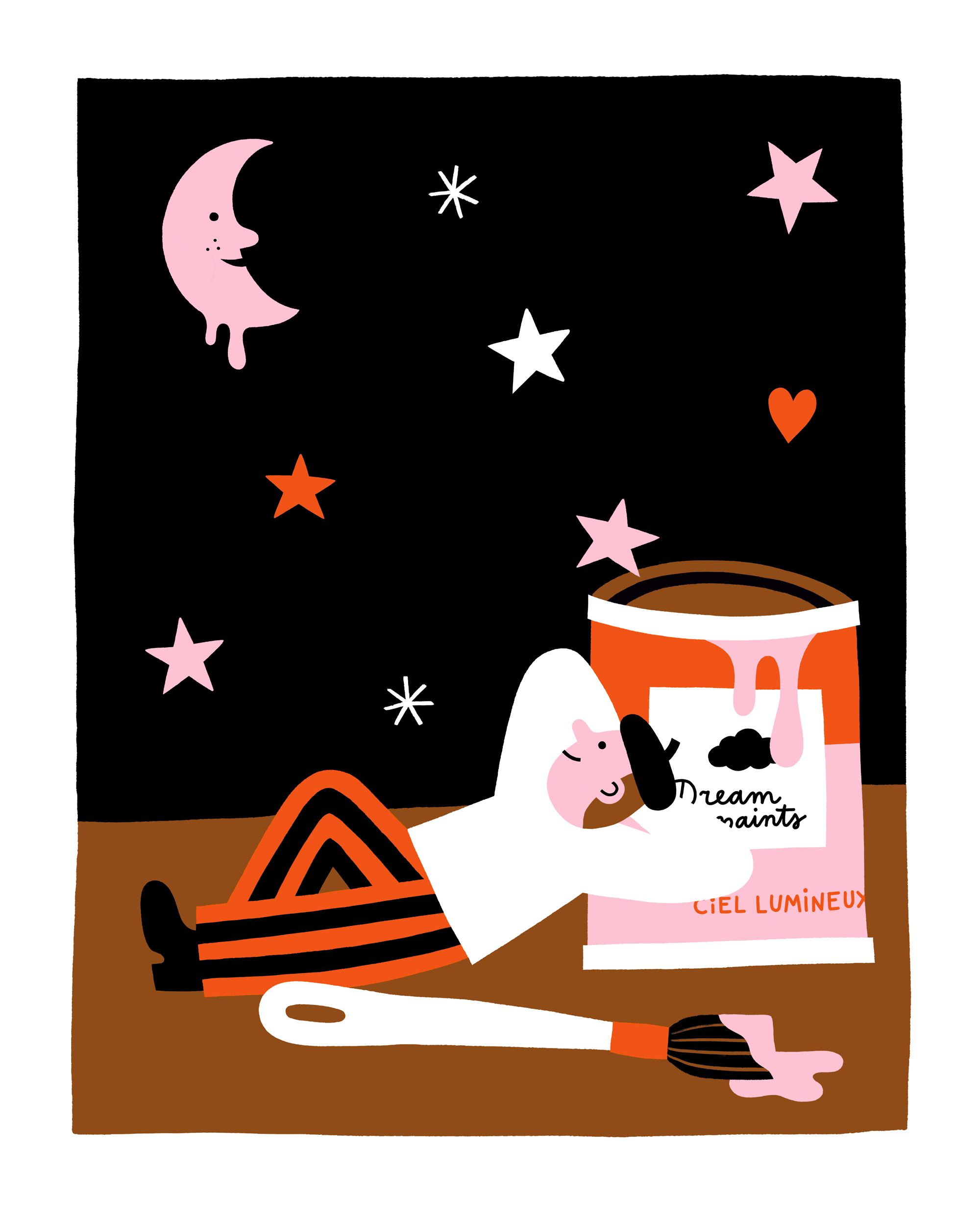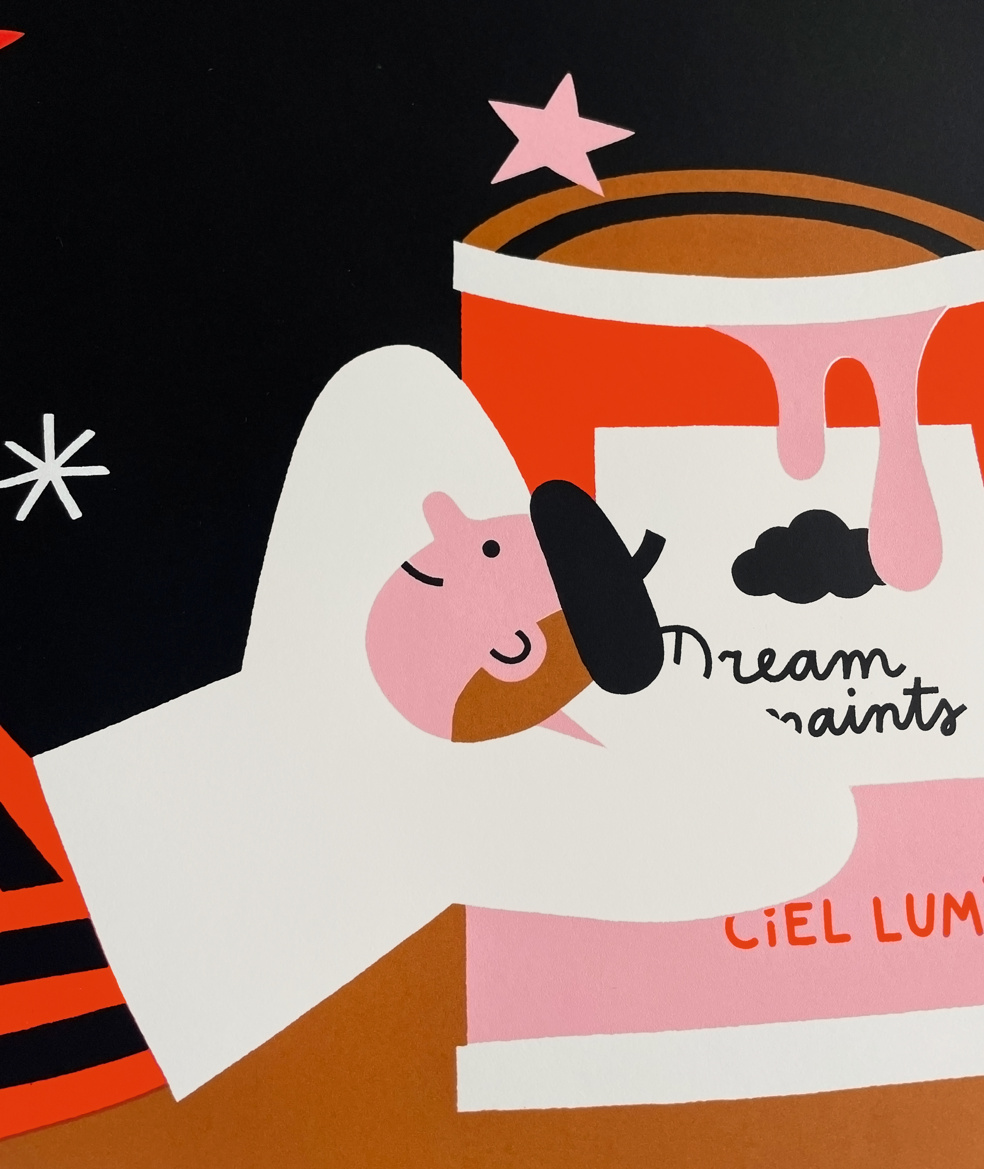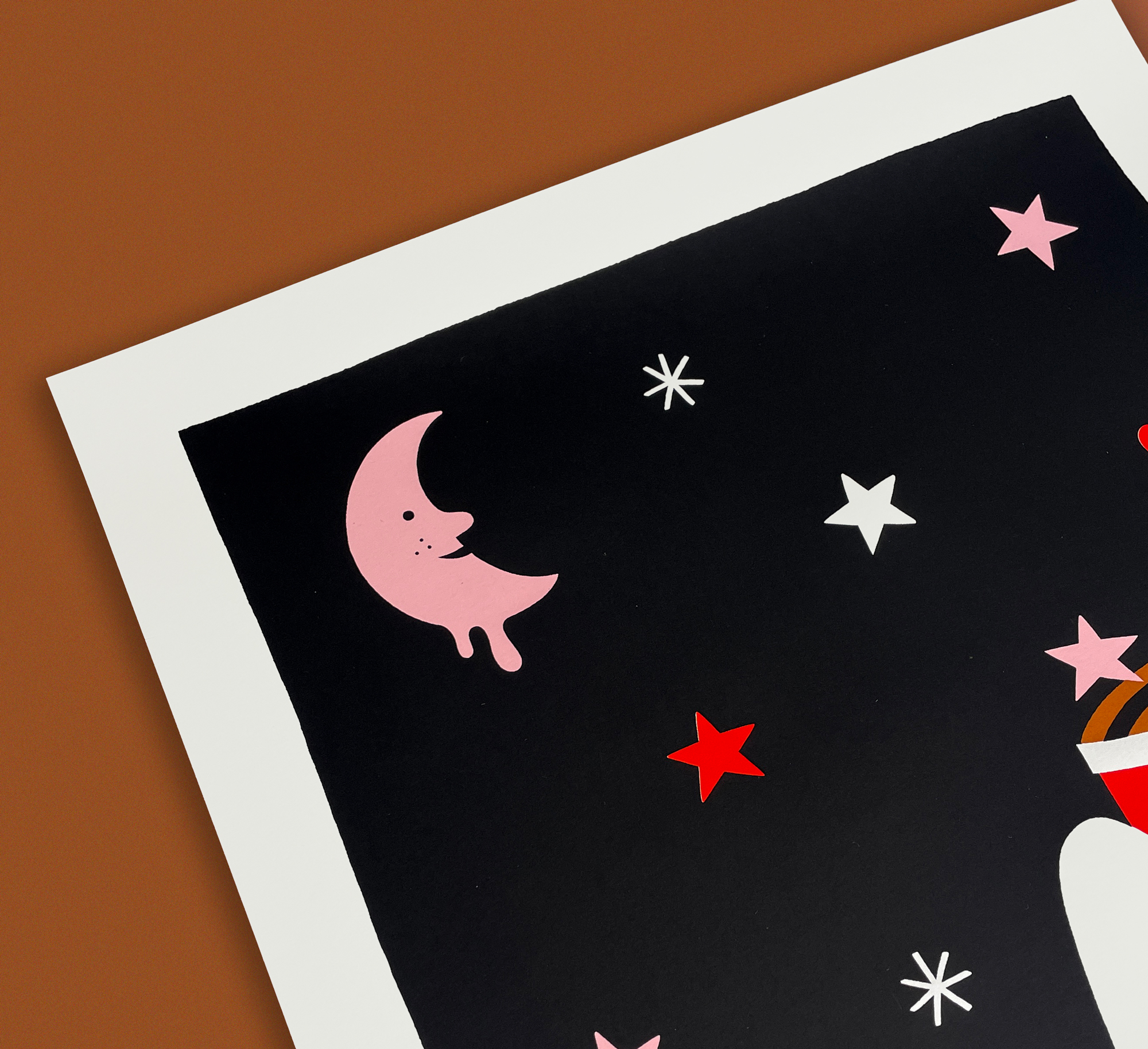 Printed in 4 warm & vibrant colors; pink, red, caramel-ish brown & black.